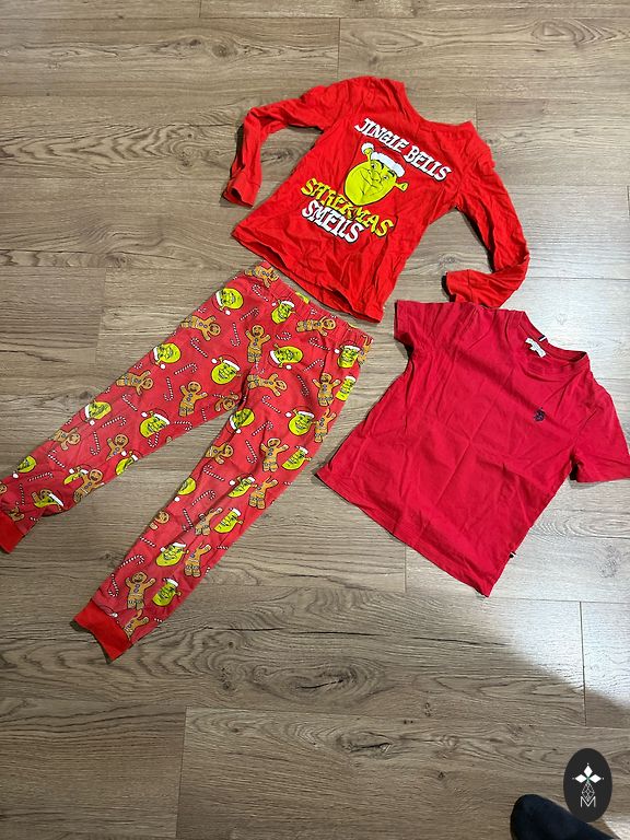 • Dark set with flannel pants – the top shows slight signs of use (fabric pilling)