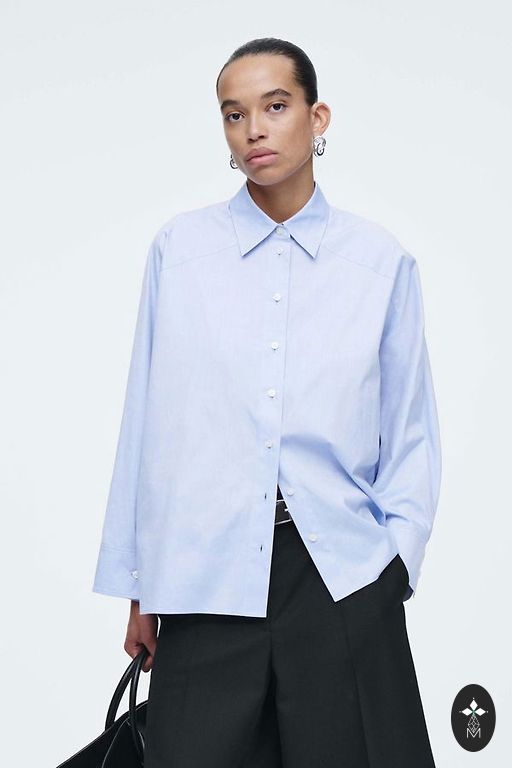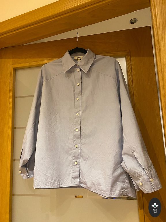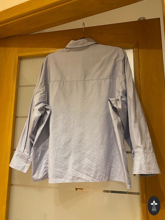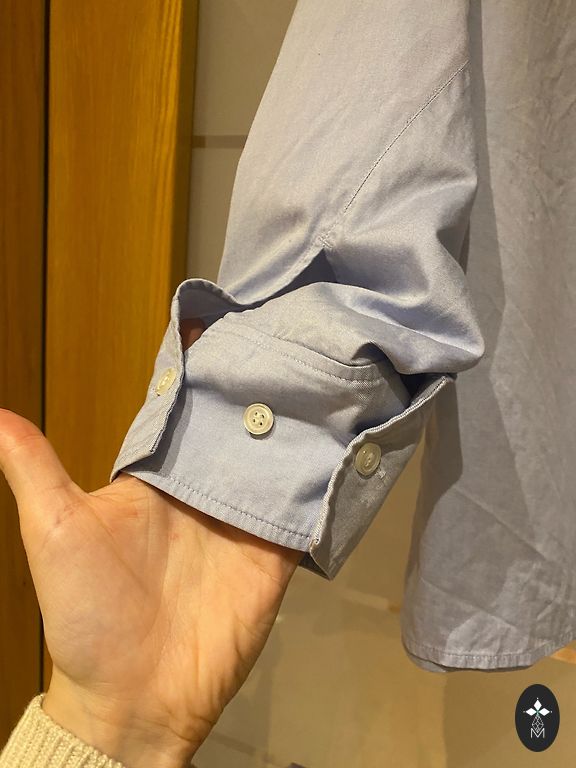Dark blue shirt with an oval bottom. It will also work great as an overshirt because the back is extended.