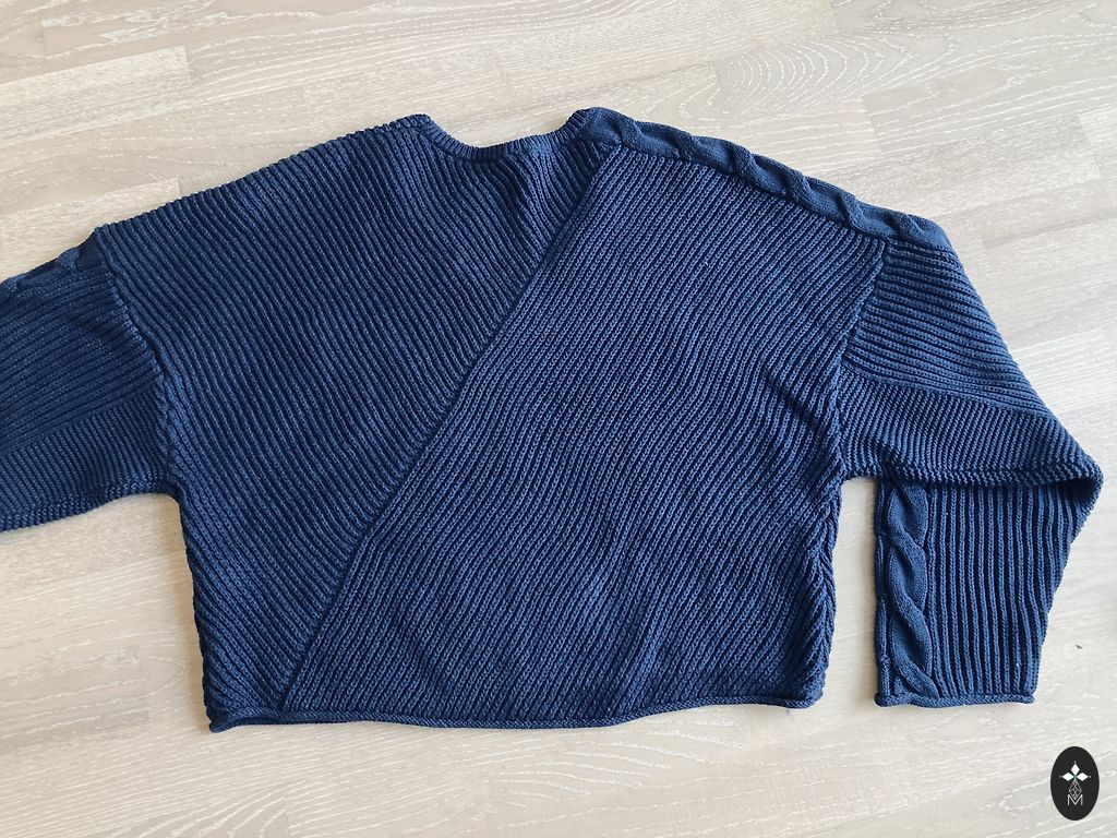 Jauns džemperītis no Itālijas, bet ir daži cm nenošūta vīle, kas nebija pamanīts pērkot. Interesants ar interesantu, dažāda garuma apakšējo malu. Krāsa pelēkzila