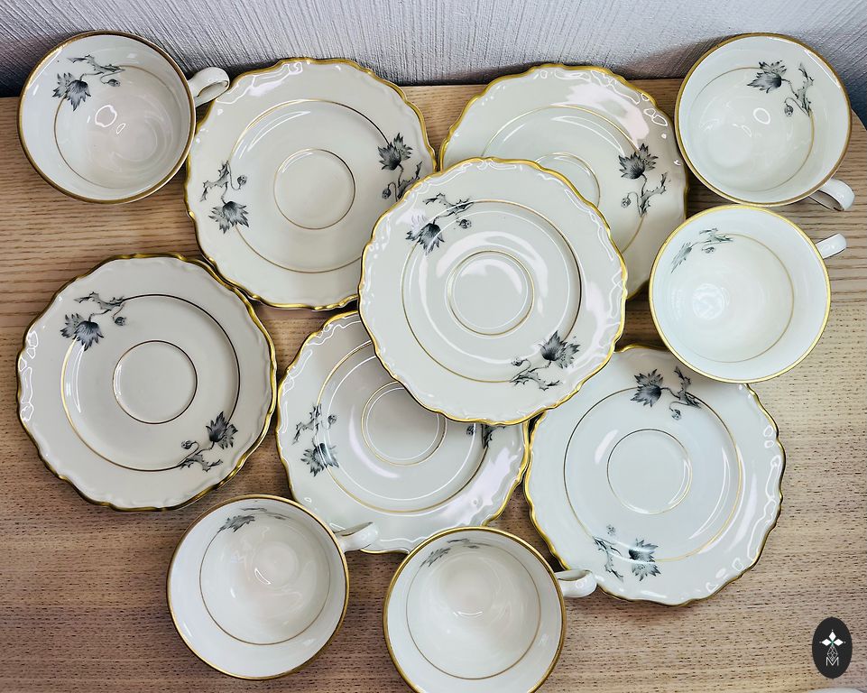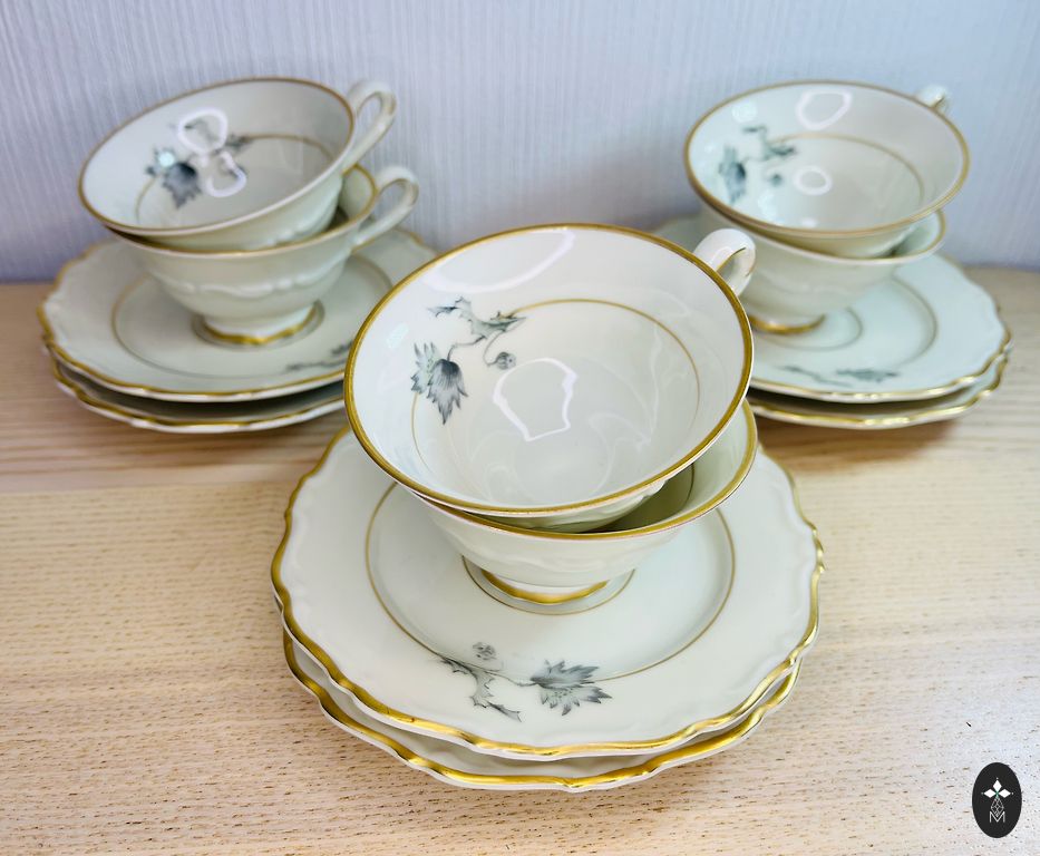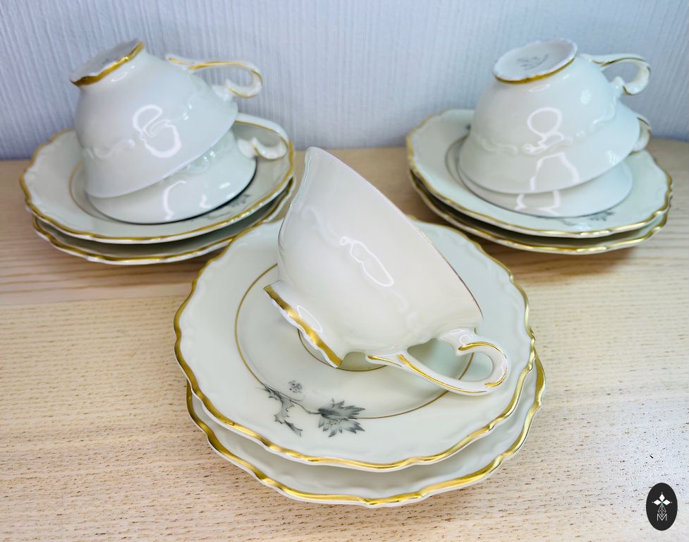 Gražus angliško kaulo porceliano trio be pažeidimų. Labai gera būklė ir išvaizda. Puodelis 150 ml, lėkštelė 13 cm, lėkštė 16,2 cm. Korekcijos spintelių lentynose.