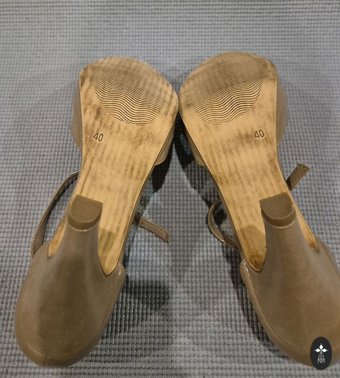 Worn a few times, there is a small defect on one of the heels, but it's not visible when worn.