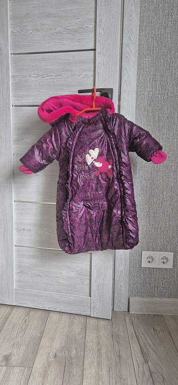 Очень теплая куртка. Носилась мало, так как куплена прошлой зимой. В комплекте шапочка с шарфом.