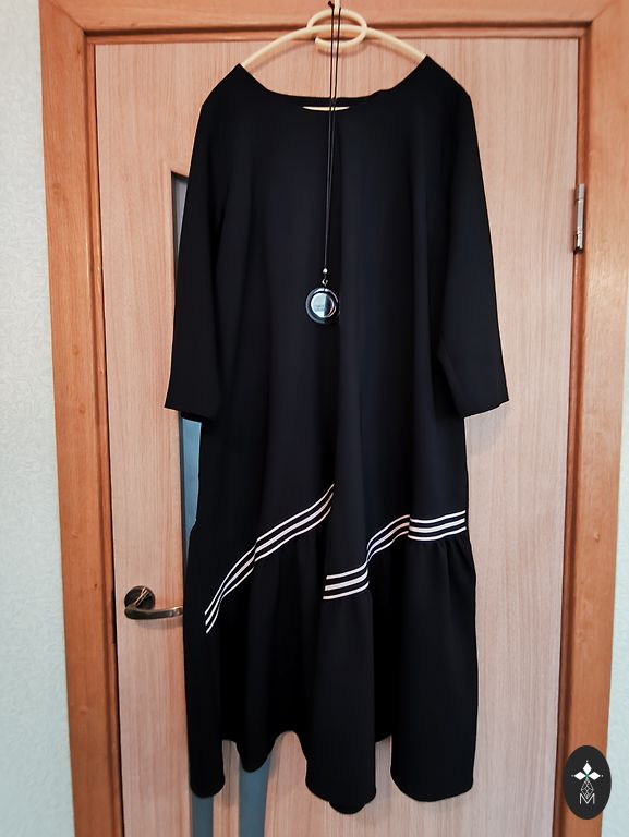 Mustade lillemustriga, suurus 48, varrukas 3/4, rinnale sobib kuni 115, allapoole trapetsikujuline lõige, on vooder.
