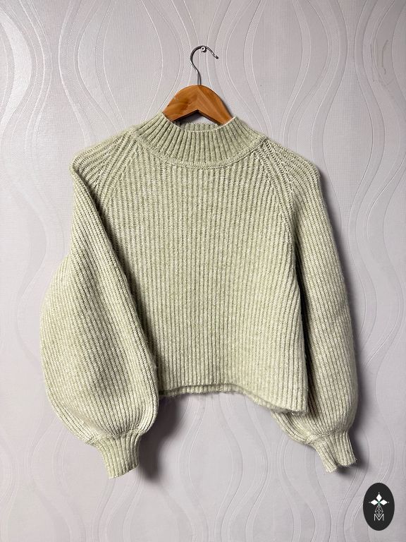 Oranžinis megztinis su „balloon“ rankovėmis.