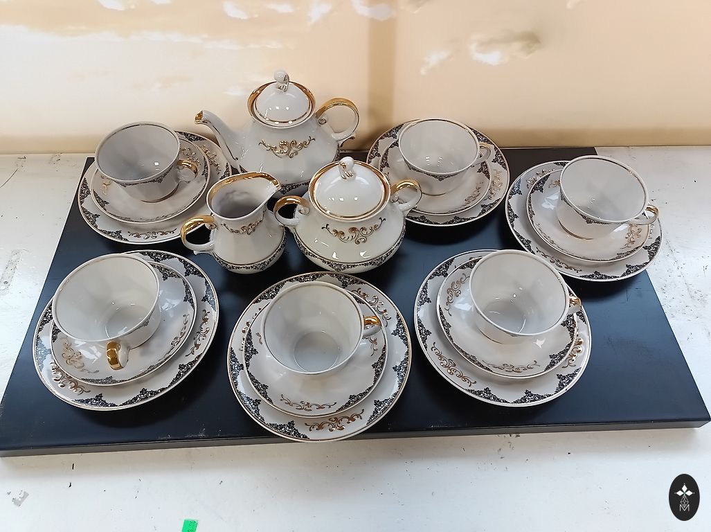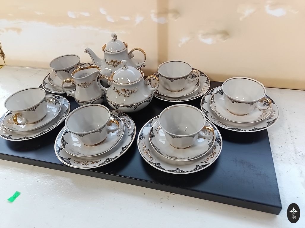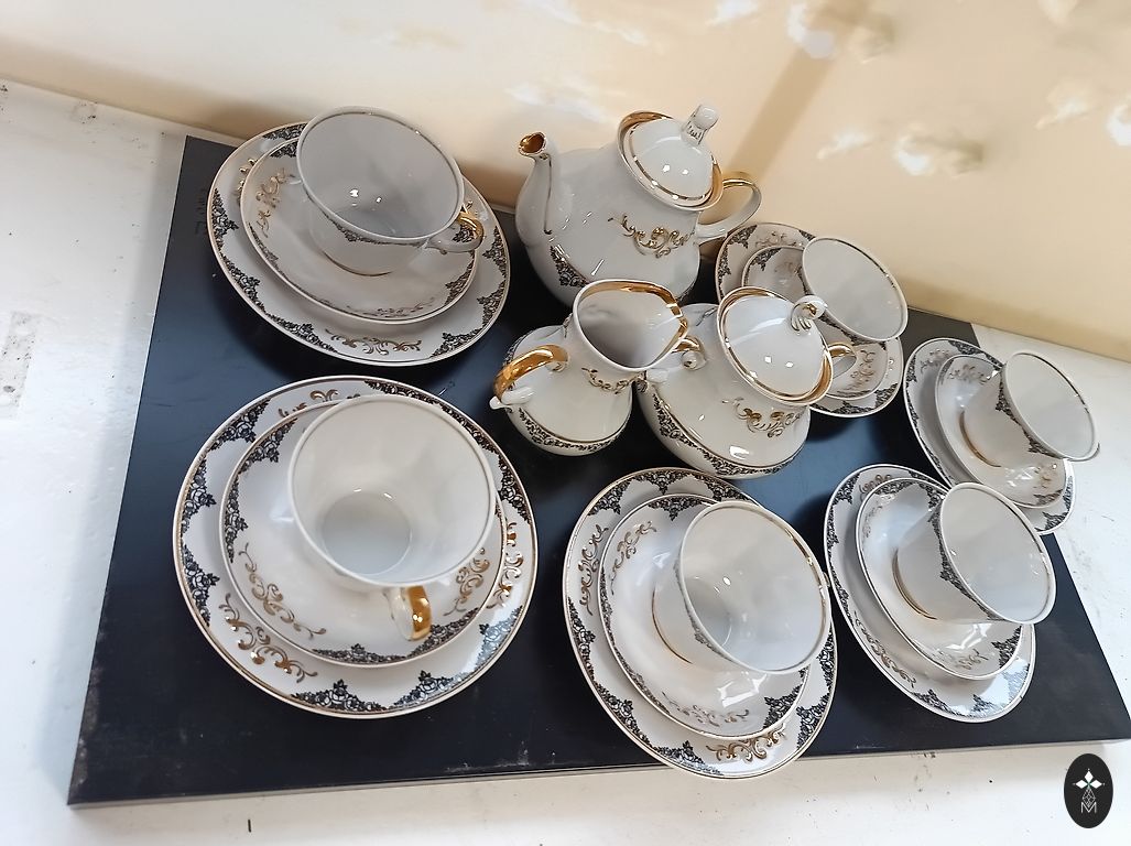 Saksa väga peen portselanserviis, kasutamata, millel on üle 50 aasta. Komplektis on 6 tassi, alustassi, koogitaldrikud, lõunataldrikud, suhkrutoos, võitoos, piimakann ja kohvikann.