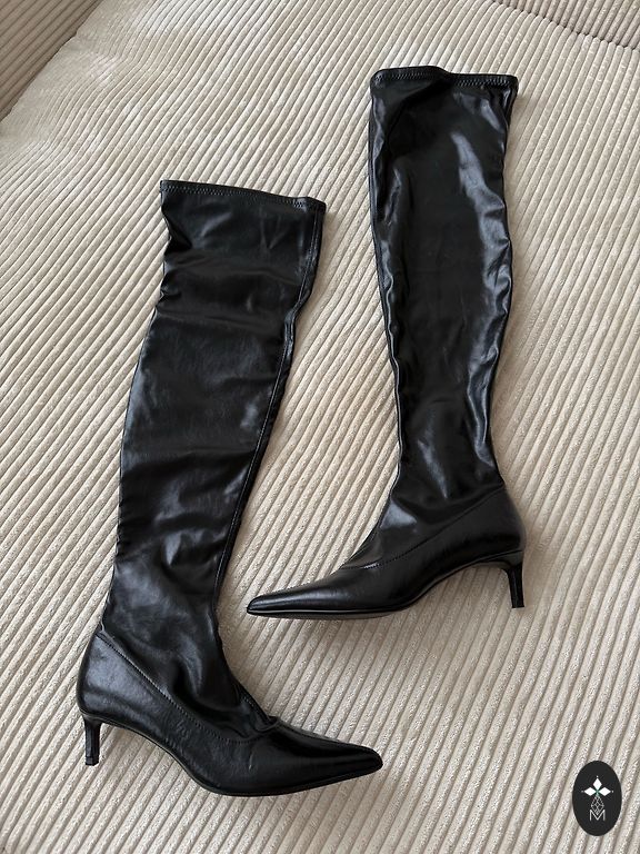 Šņorējami zābaki ar rāvējslēdzēja aizdari. Papēdis 4,5cm, zābaka garums 35cm Bez defektiem. Labi izskatās gan ar biksēm, gan svārkiem.