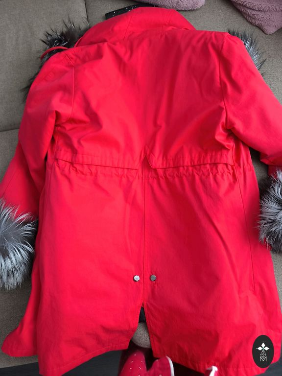 Зимняя куртка с капюшоном (пух съемный) и шнурком на талии. Длина ~80 см.