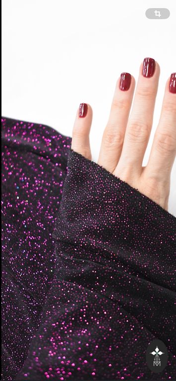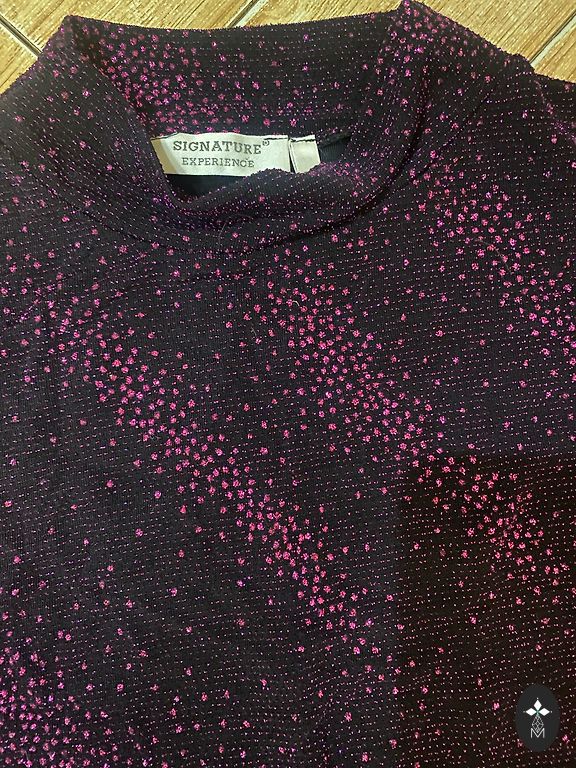 Tume lilla sametist topp, millel on säravad litrid. Mustad poolläbipaistvad kerged materjalist varrukad, millel on kummid õlgadel ja randmel.