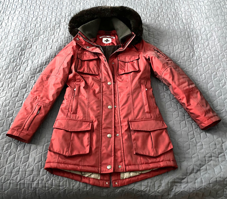 Medium-length parka, height in pictures 165 cm, lined inside with rabbit fur, natural and rich fur, the entire fur lining can be removed, can also be worn in cooler weather. The fabric is waterproof, very practical in use.