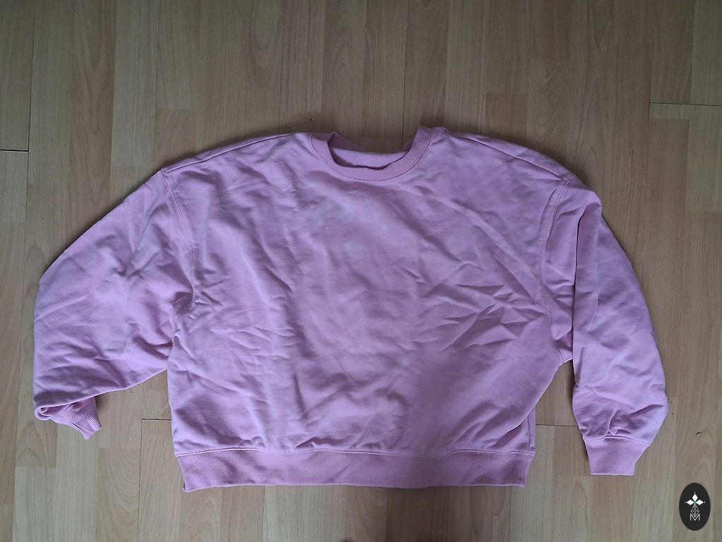 Very beautiful sweater, fits size L/XL. There is a small stain on the bottom that is not visible at all (4th picture) and a zipper on the inside that can be pulled in (last picture). Old rose color.